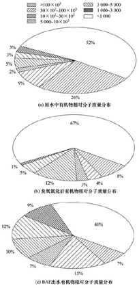 臭氧氧化和BAF降解對(duì)廢水中有機(jī)物的相對(duì)分子質(zhì)量的變化有顯著影響. 如圖 5所示,原水中的有機(jī)物主要集中在相對(duì)分子質(zhì)量小于1000和大于100×103,其分別占總量的52%、 26%,經(jīng)臭氧氧化后,廢水中的有機(jī)物相對(duì)分子質(zhì)量分布得到明顯的改變,小于1000的有機(jī)物提高為67%,而大于100×103的有機(jī)物降為8%. 因此臭氧氧化可使大分子有機(jī)物轉(zhuǎn)化為小分子有機(jī)物,使大分子有機(jī)物比例明顯降低,小分子有機(jī)物比例顯著增加. 由于小分子有機(jī)物更容易被微生物代謝所利用,因此臭氧氧化強(qiáng)化了后續(xù)BAF單元對(duì)該部分有機(jī)物的去除,這從BAF單元出水中的有機(jī)物相對(duì)分子質(zhì)量分布情況可以看出,經(jīng)BAF單元的微生物降解后,相對(duì)分子質(zhì)量小于1000的有機(jī)物的比例從67%降低至40%. 由于BAF單元出水中含有微生物次生代謝產(chǎn)物等物質(zhì),而該部分物質(zhì)較短的停留時(shí)間內(nèi)不容易被降解,所以相對(duì)分子質(zhì)量小于1000有機(jī)物所占比例仍有40%. 大分子有機(jī)物則很難被濾池內(nèi)微生物降解,所以所占比例沒有發(fā)生明顯變化.