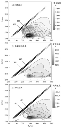 圖 6原水、臭氧氧化出水及BAF出水的三維熒光圖Fig.6Three-dimensional fluorescence spectra of rawwater, ozonation effluent and BAF effluent during the treatment